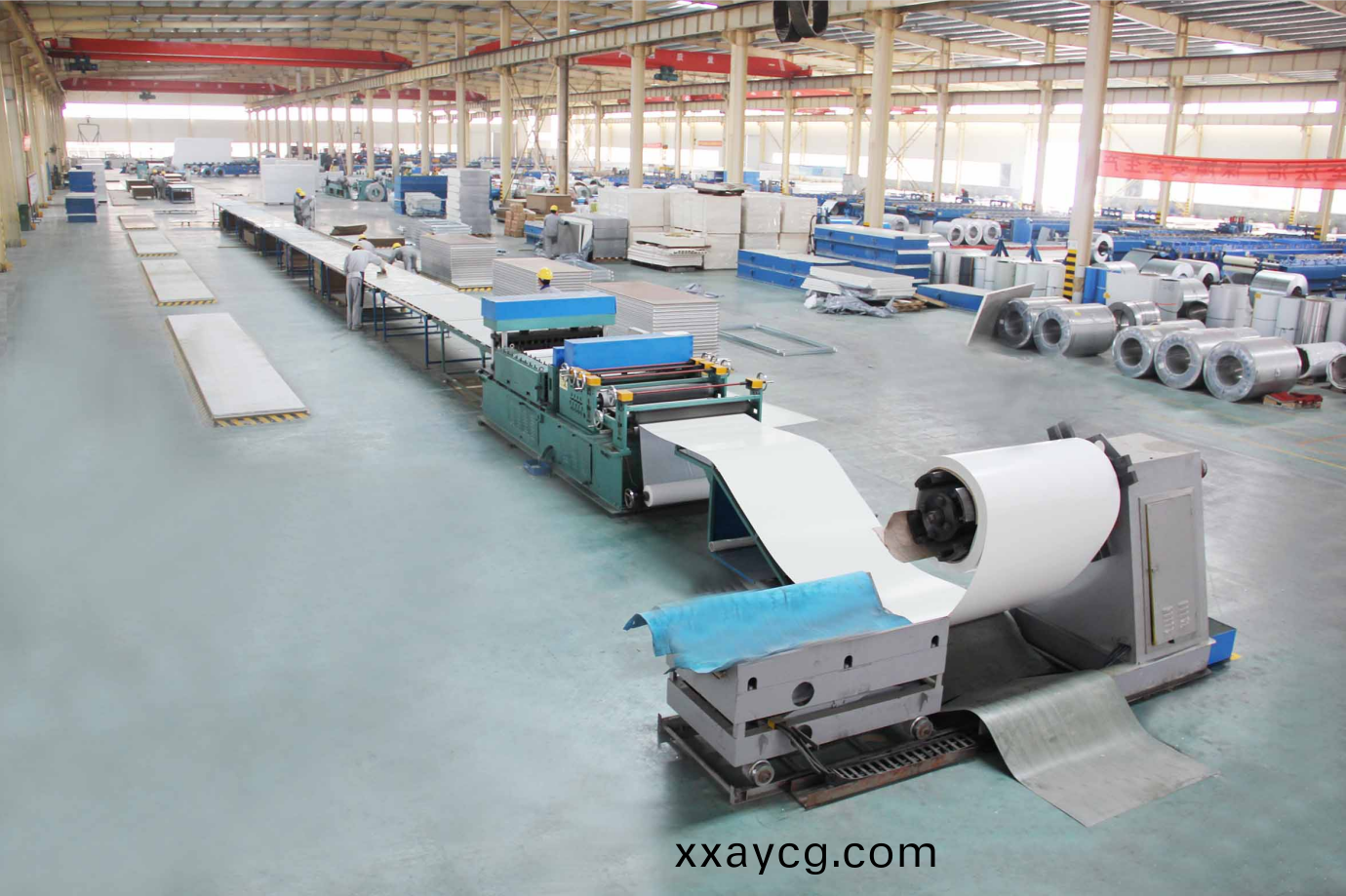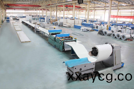 自(zi)主設(she)計,定(ding)製生産線,可(ke)生産(chan)加(jia)工0.5-1.2mm厚度的(de)綵(cai)鋼(gang)闆咊(he)不鏽鋼(gang)
